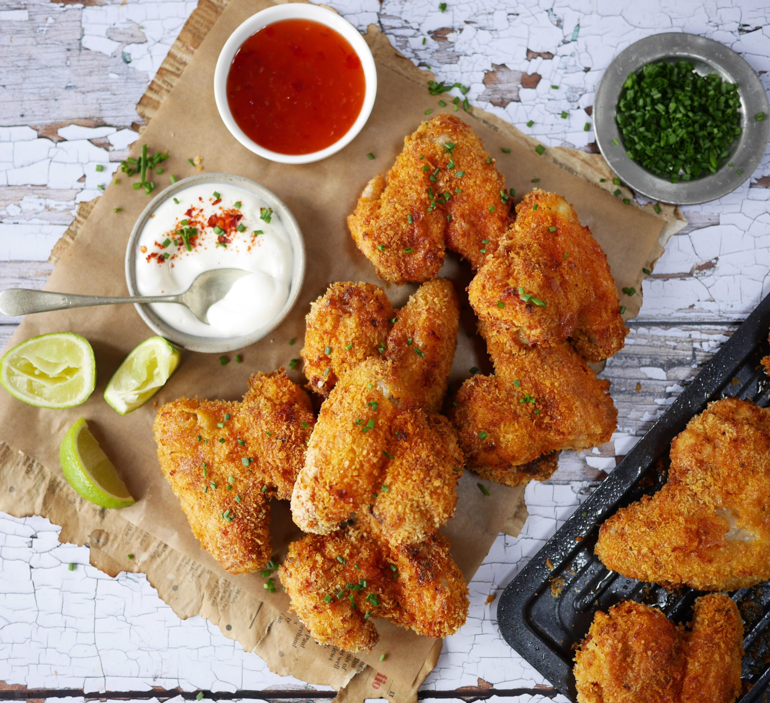 - När kycklingvingarna är helt täckta med mjöl, ägg och panko, lägg dem på den rena tallriken. Upprepa detta med de återstående vingarna.